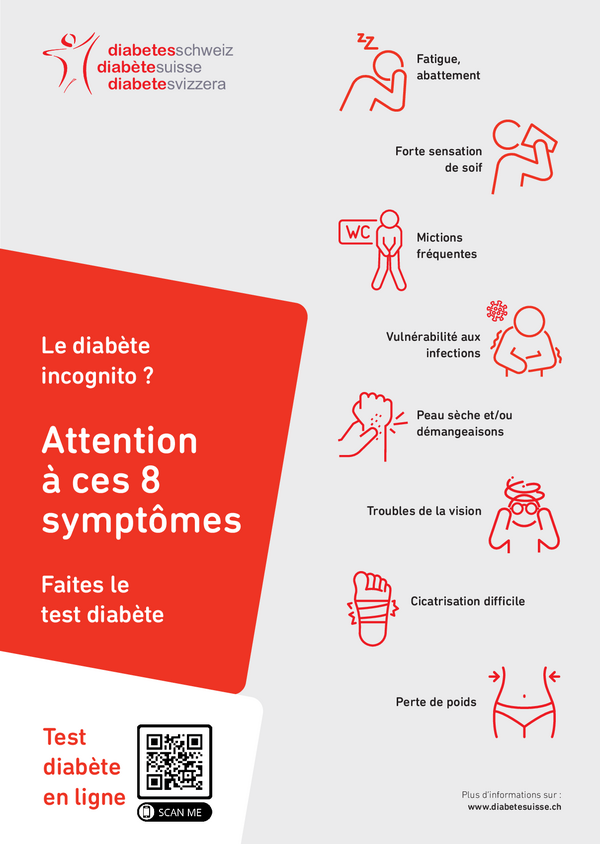 Pour la Journée mondiale du diabète du 14 novembre, diverses activités d’information seront organisées sur les facteurs de risque et les symptômes du diabète de type 2. Au stade précoce, les symptômes ne sont pas ou peu perceptibles et sont sans lien évident avec le diabète.
