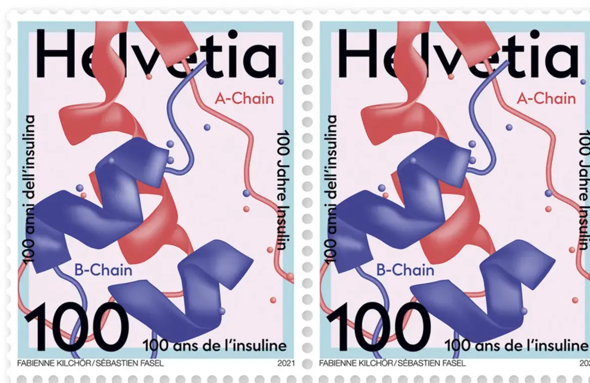 À l’occasion de cet anniversaire, un timbre-poste spécial de CHF 1.- est émis le 4 mars 2021 par la Poste suisse en l’honneur de cette hormone vitale. Jusqu’en 1921, un diagnostic de «diabète de type 1» était synonyme d’une condamnation à mort. En règle générale, les personnes qui en souffraient mouraient rapidement. C’est en 1921 que Frederick Banting et son assistant Charles Best de l’université de Toronto (Canada) ont réussi à isoler l’insuline pour la première fois. La découverte de l’insuline a été révolutionnaire et permet aujourd'hui aux diabétiques insulino-dépendants de mener une vie largement autonome.